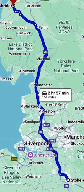 | The Distance from Kirkbride to Bath was 290 miles. Too far to drive in one day in UK. So we broke the journey at Stoke-on-trent. |