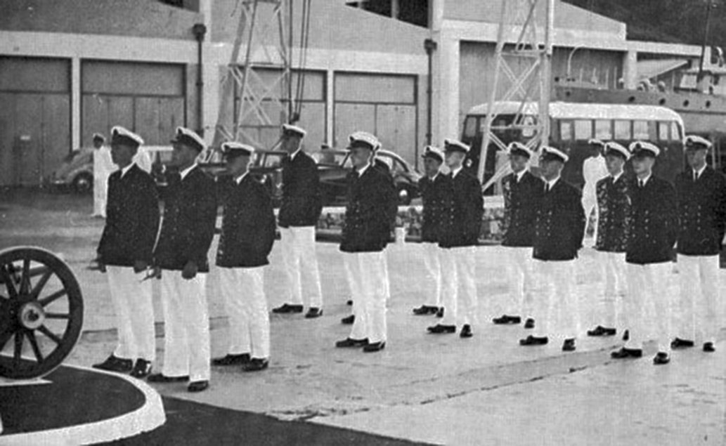 at Sunset Ceremony : Prize Day 1964 From Right DAP Pistor, Al Vijoen, Tony van der Meer, Looking UP?, Geof Collins, Peter O'Hare. Left of Flagpole 2 unknown Cadets Saluting and 1 with Flag Draped over Arm while Saluting? |